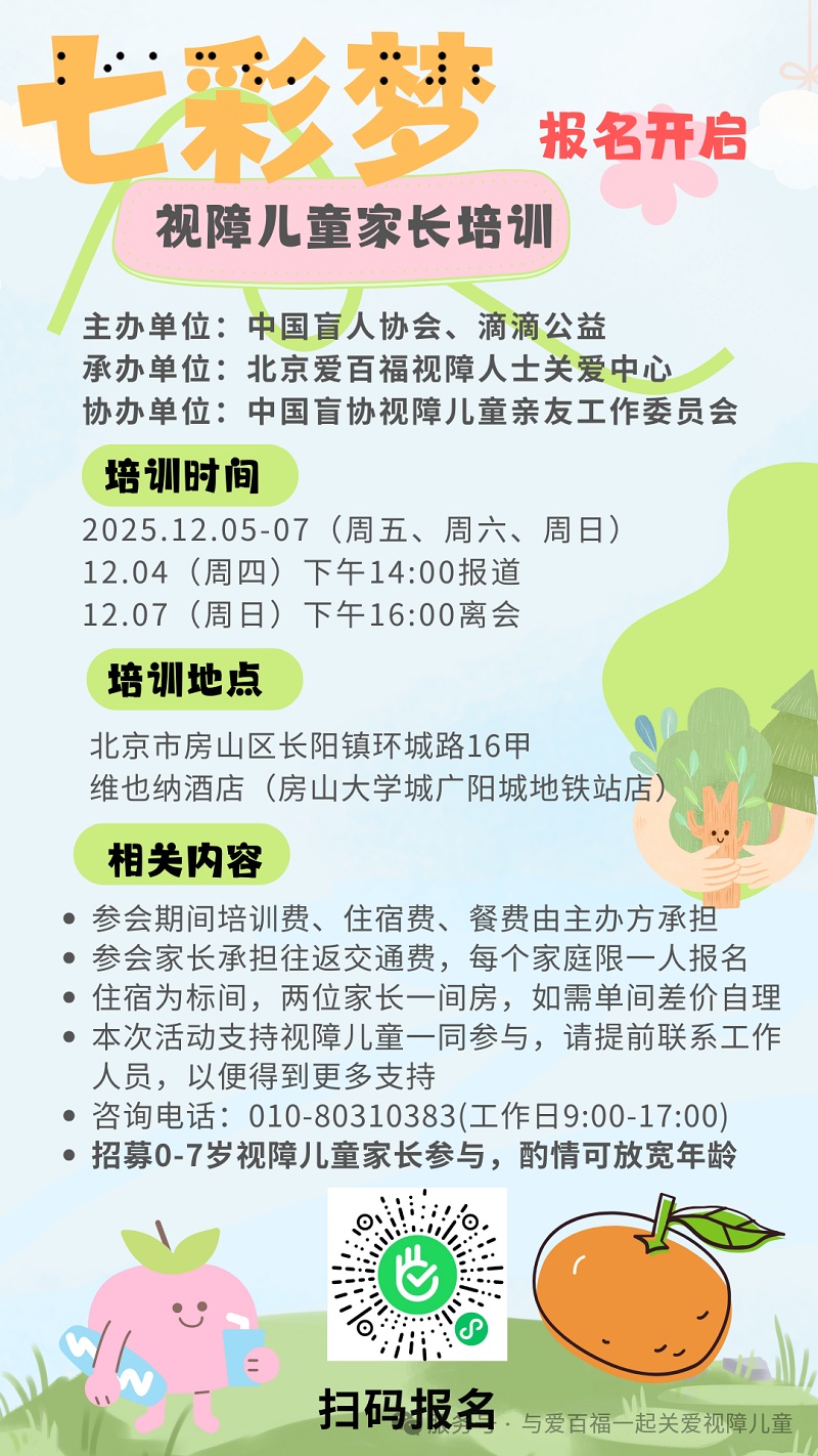全国 0-7 岁视障儿童家长,限 70 人,酌情放宽年龄联系人:方老师联系电话:010-80310383(工作日早9:00-17:00)联系微信:18610718056(备注七彩梦视障儿童家长培训)参加培训家长需自行承担自己和儿童往返交通费,住宿费培训费、材料费、培训期间餐费由主办方承担。扫码报名: