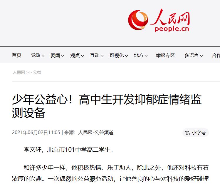20210602【人民网】少年公益心!高中生开发抑郁症情绪监测设备