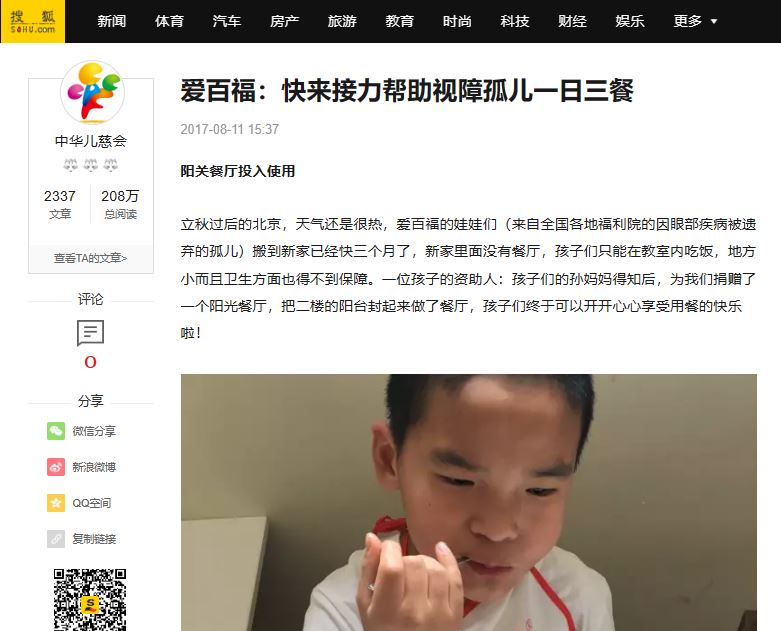 20170811【搜狐】中华儿慈会 爱百福:快来接力帮助视障孤儿一日三餐