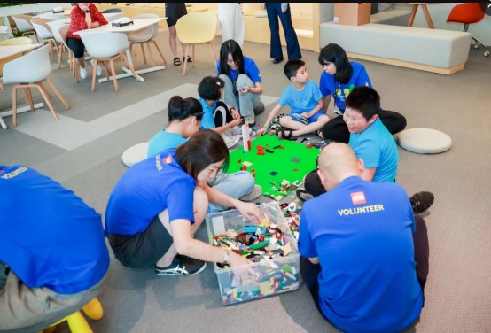 在为期两天的活动中,孩子们、家长们、乐高集团的员工志愿者以及爱百福的老师们一起拼搭、想象、认识前盲文点位、通过盲文乐高积木颗粒了解盲文数字。更加难忘的是在乐高集团中国区总部办公室,孩子们和志愿者们在法国籍专家Marie Oddoux和Marc Angelier的指导下,以乐高积木颗粒为媒介,勇敢探索新环境并且快乐拼搭!