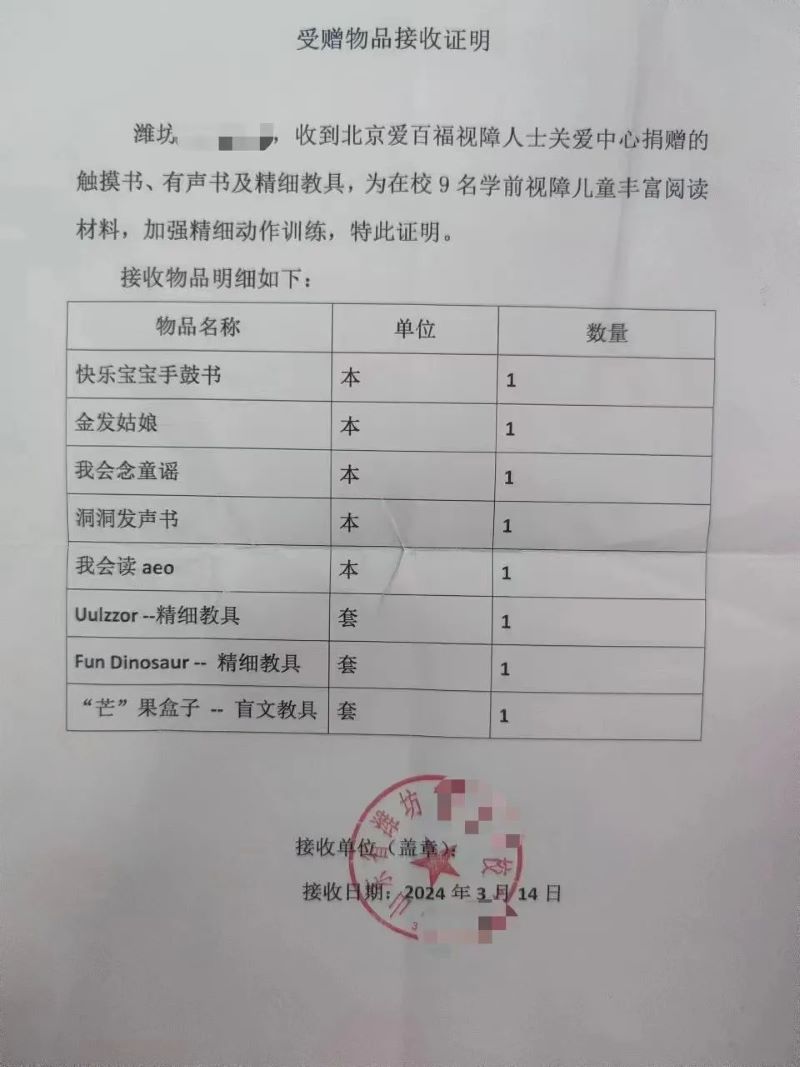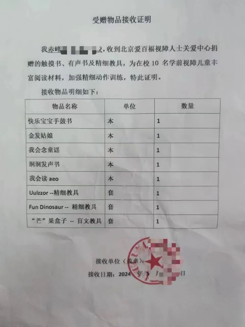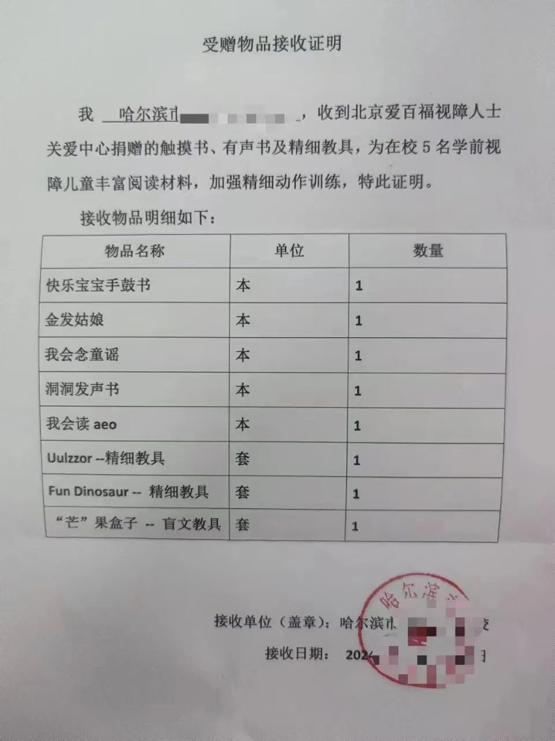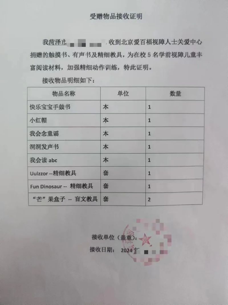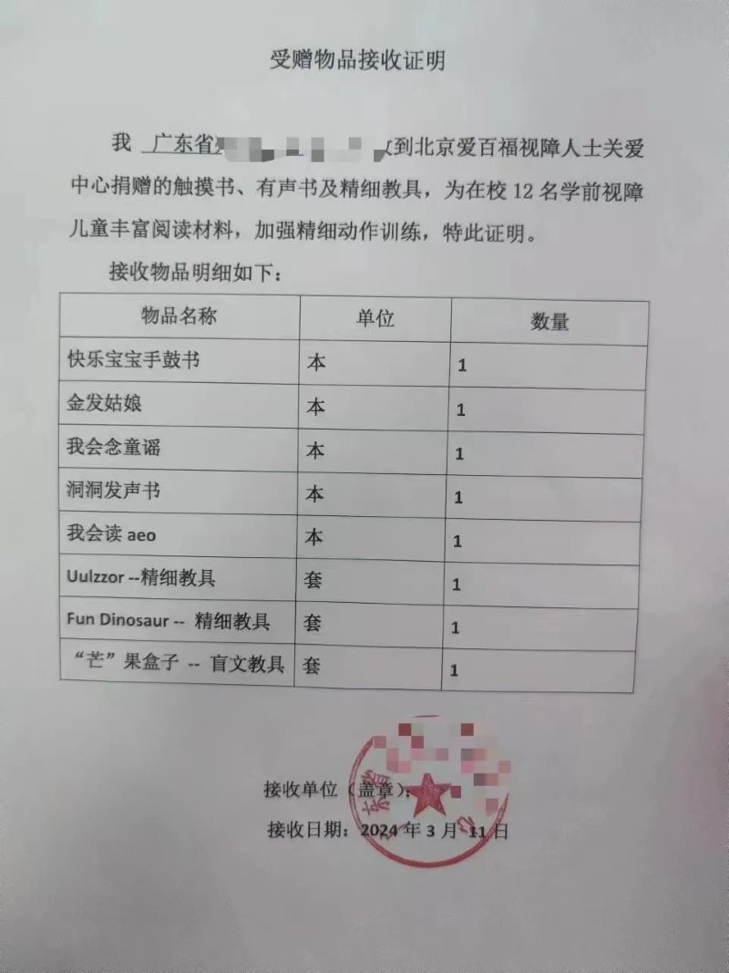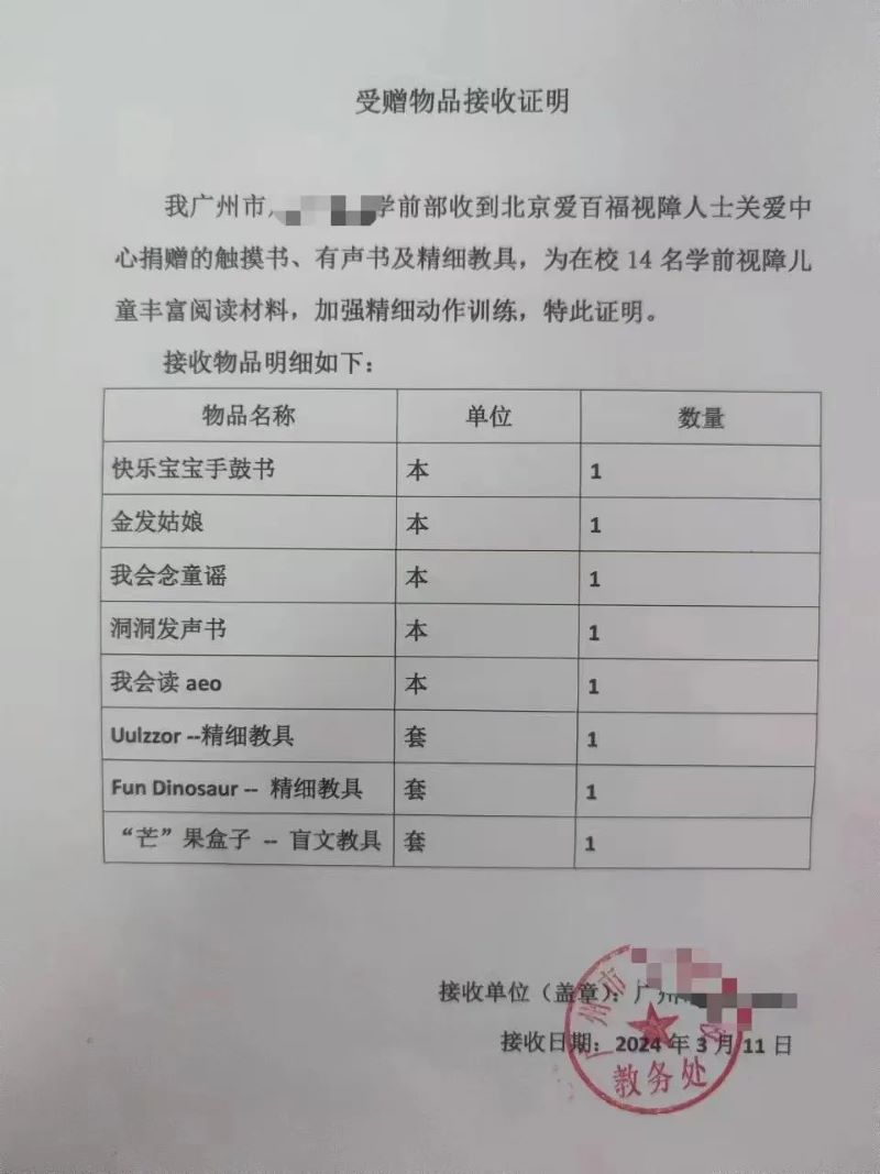 在充满爱与关怀的2024年,北京爱百福视障人士关爱中心积极响应社会呼吁和特殊教育学校需求,针对视障儿童早期盲文学习和阅读发放教具关怀包。本次关怀活动旨在通过提供适宜的教学工具,为视障儿童创造更好的学习环境,助力他们的健康成长。目前,教具关怀包已顺利送达21所学校,并附上了接收证明和返图,现将相关情况反馈如下。