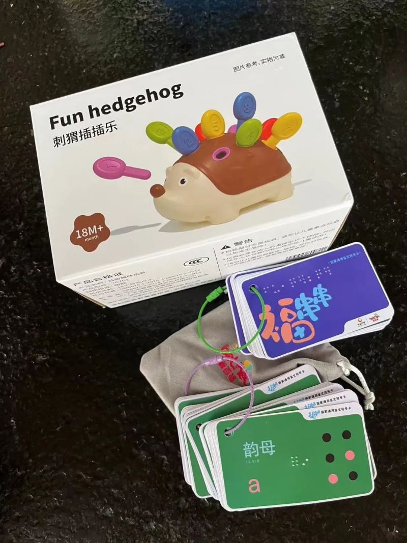 在大家的共同努力下,我们成功地为120名视障儿童发放了教具关怀包。每个关怀包中都包含了“福串串”国家通用盲文字符卡套装和“盲文刺猬插插乐”套组,这些教具不仅设计新颖、实用性强,而且充分考虑了视障儿童的特殊需求。